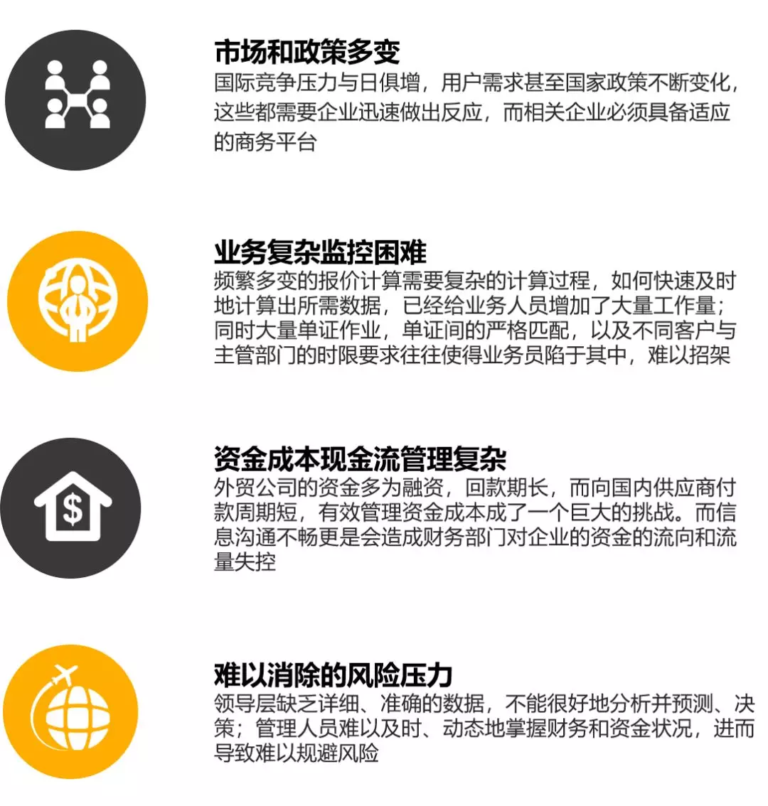 面對快速發(fā)展的勢頭和巨大的市場機遇,貿(mào)易行業(yè)的企業(yè)在內(nèi)部管理,尤其是信息化管理方面,始終存在幾個難解的問題: