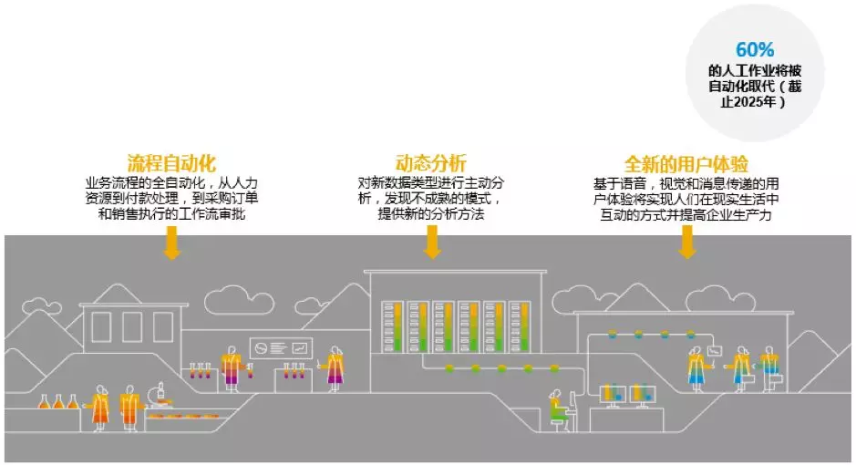 根據(jù)SAP公司及行業(yè)協(xié)會(huì)做的商業(yè)分析和預(yù)測(cè),到2025年全球運(yùn)營(yíng)的現(xiàn)代化商業(yè)中,將有60%的人工作業(yè)將被自動(dòng)化所取代,這些領(lǐng)域包括且不限于,制造業(yè),銀行業(yè),保險(xiǎn)業(yè),零售終端,倉(cāng)儲(chǔ)配送等等。現(xiàn)代企業(yè)主要對(duì)業(yè)務(wù)流程自動(dòng)化,企業(yè)數(shù)據(jù)動(dòng)態(tài)分析,以及新的用戶體驗(yàn)有著極高的需求和期待。