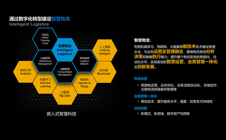 建設(shè)智慧物流。利用創(chuàng)新技術(shù)建設(shè)智慧企業(yè),提高物流系統(tǒng)分析決策和智能執(zhí)行能力,提升行業(yè)智能化、自動化、柔性水平,實現(xiàn)業(yè)務(wù)管理一體化及創(chuàng)新發(fā)展。